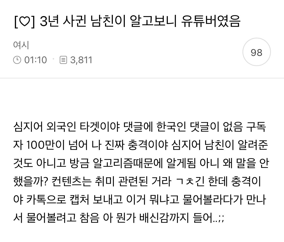 자유게시판 3년 사귄 남친이 알고보니 100만 유튜버 익명 157 views 3 수정/삭제 비밀번호 입력 영어, 숫자, !@#$%^&*() 수정 삭제 링크복사 댓글 1 영어, 숫자, !@#$%^&*() 취소 댓글등록 익명 100만이면 능력자네...ㅎㄷㄷ 추천 동영상
