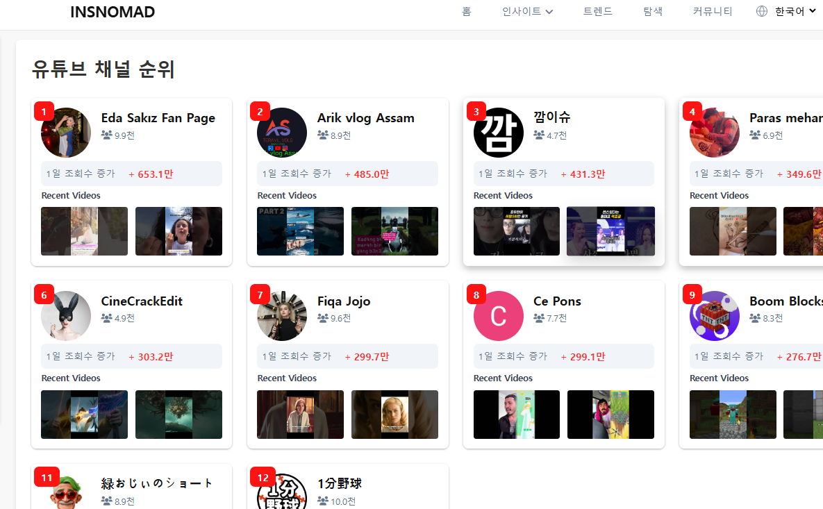 자유게시판 순위 페이지 생김 익명 120 views 구독자 구간별로 볼 수 있네 2 수정/삭제 비밀번호 입력 영어, 숫자, !@#$%^&*() 수정 삭제 링크복사 댓글 0 영어, 숫자, !@#$%^&*() 취소 댓글등록 추천 동영상